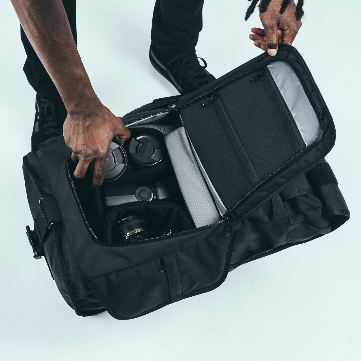 Padded camera insert holds a variety of DSLR or mirrorless bodies with additional lenses, flashes and other gear