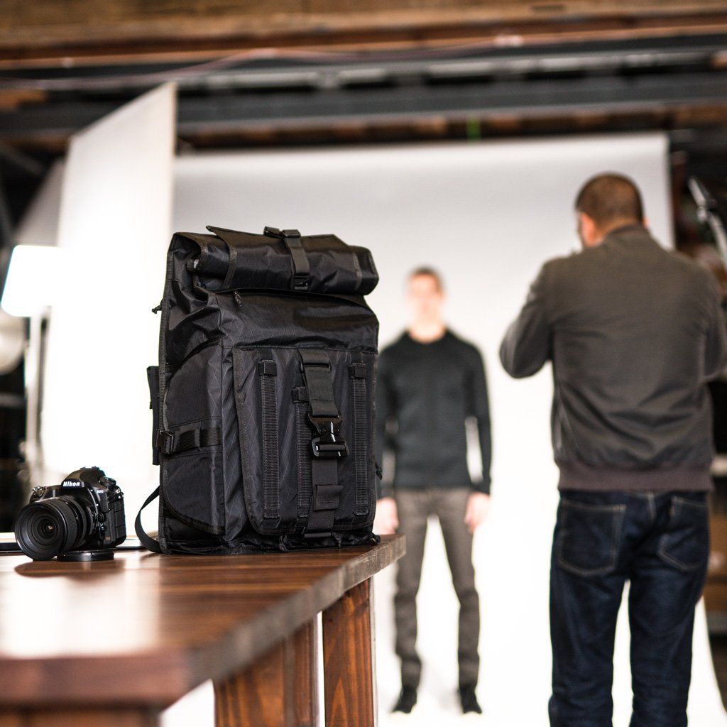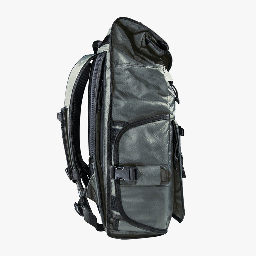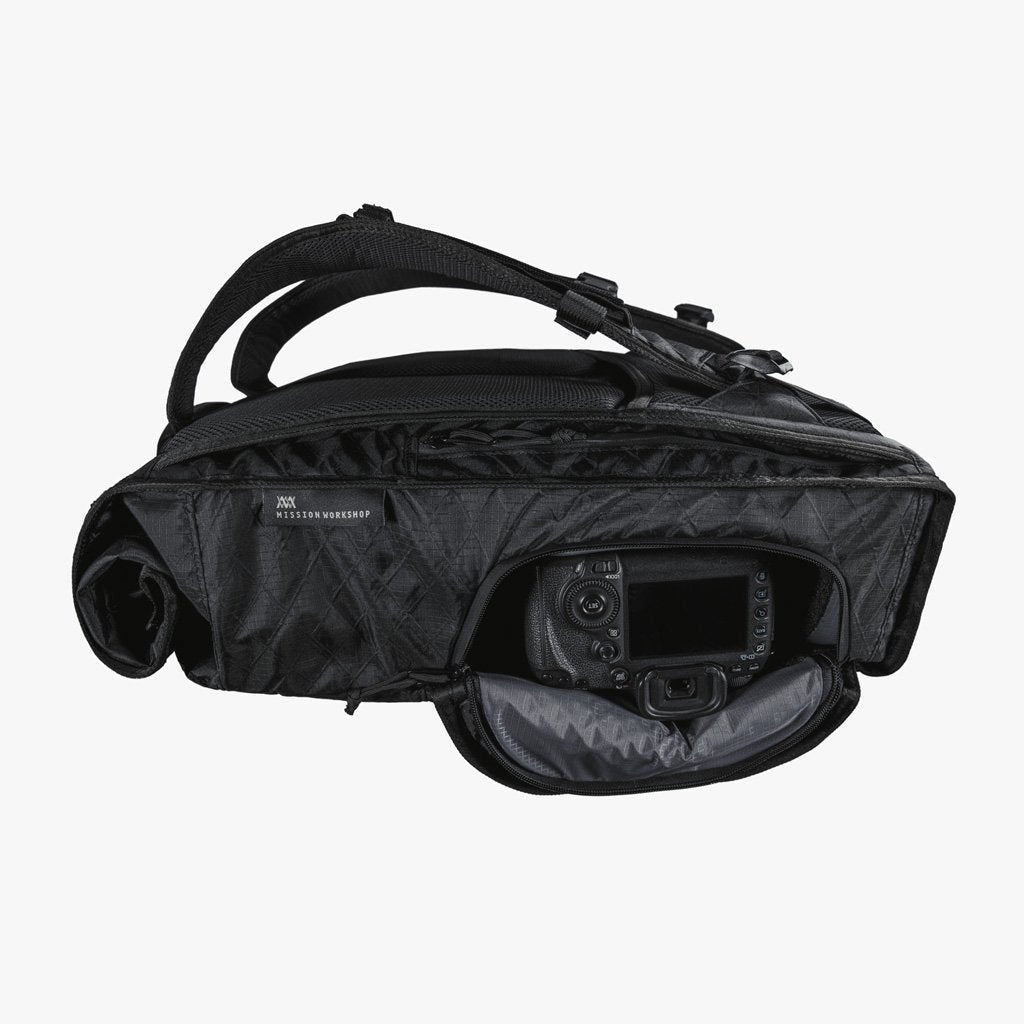 3 access points to camera gear: zippered front panel, quick-access side panel, and roll top