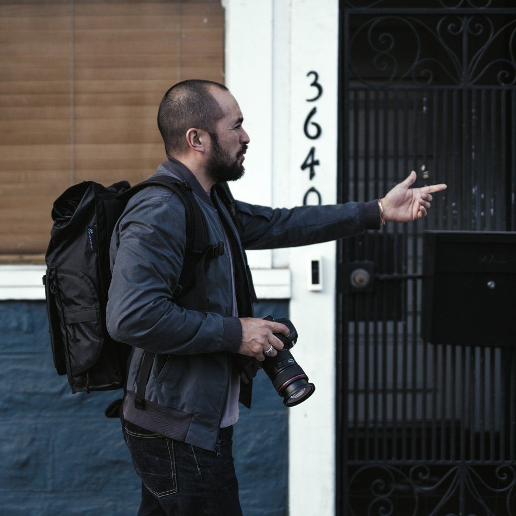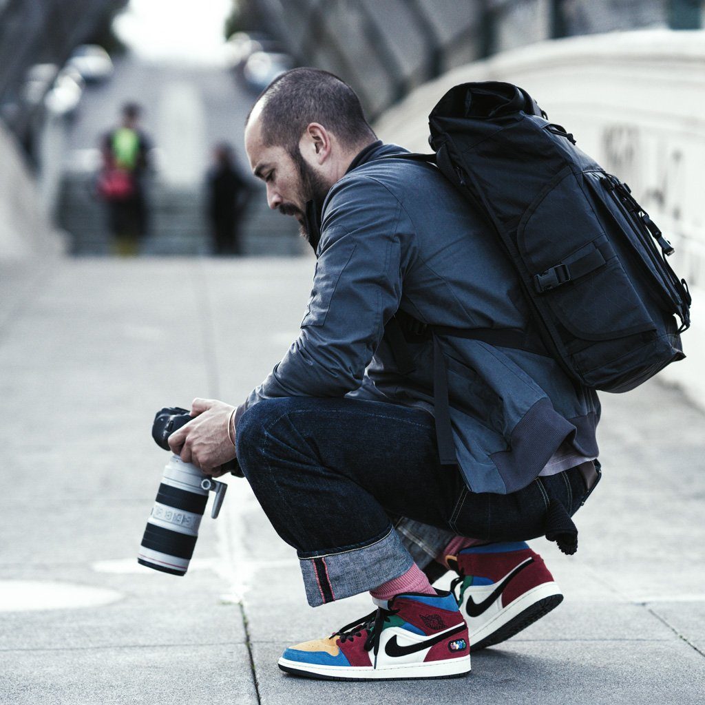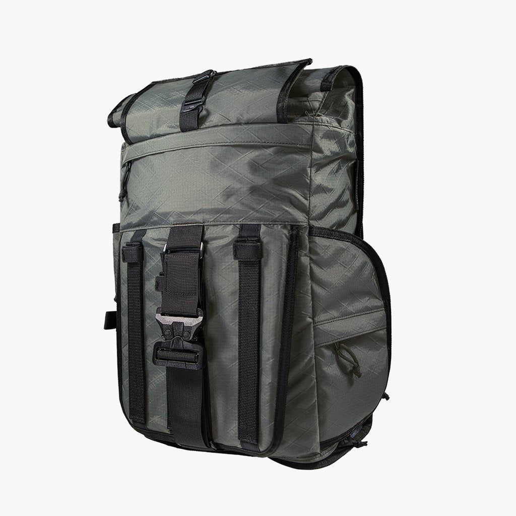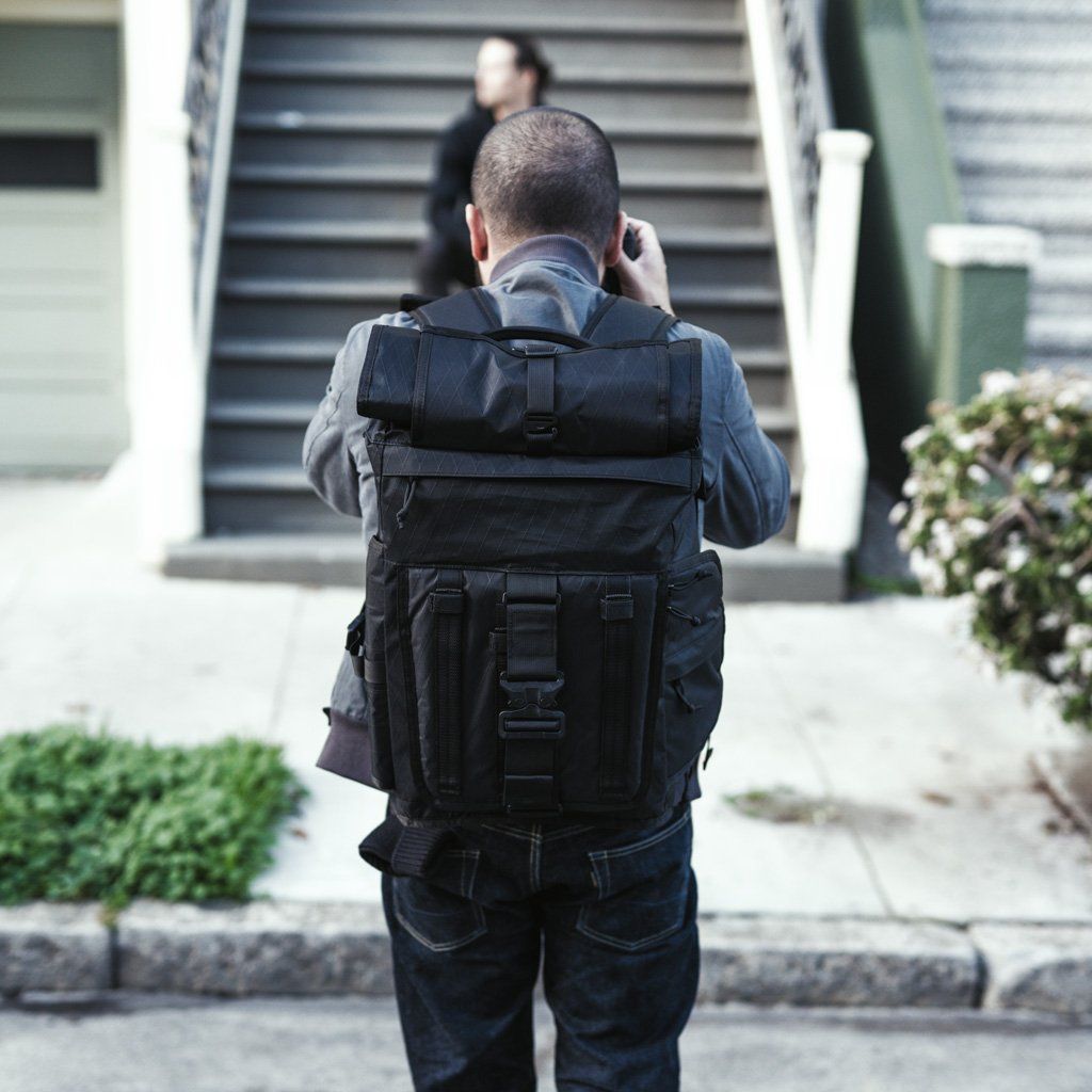 3 access points to camera gear: zippered front panel, quick-access side panel, and roll top