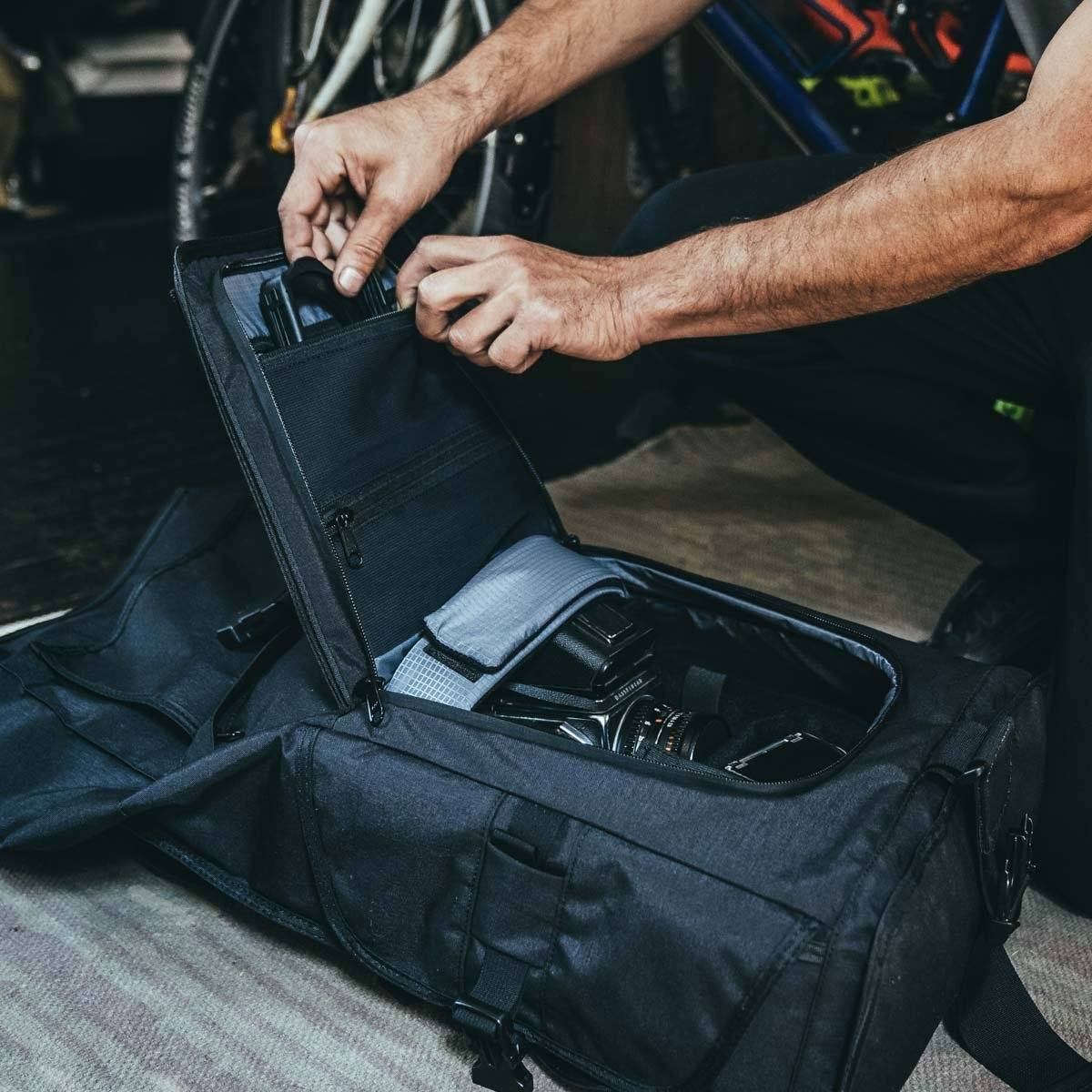 Padded camera insert holds a variety of DSLR or mirrorless bodies with additional lenses, flashes and other gear