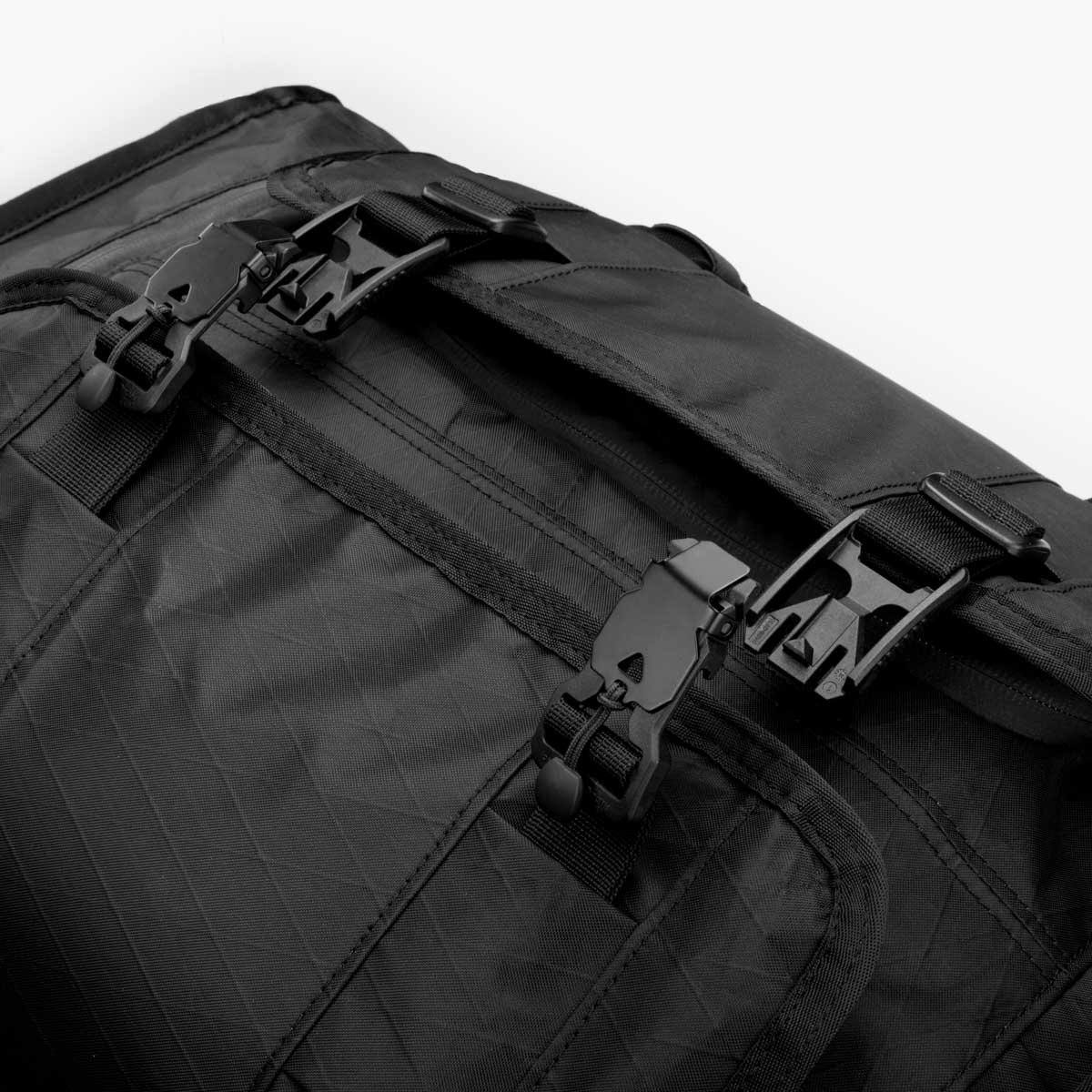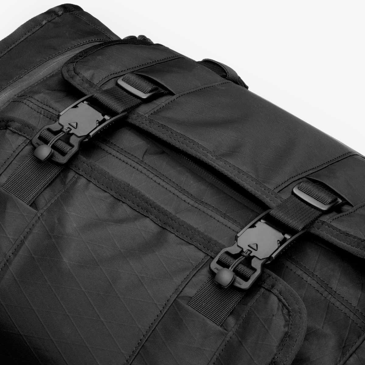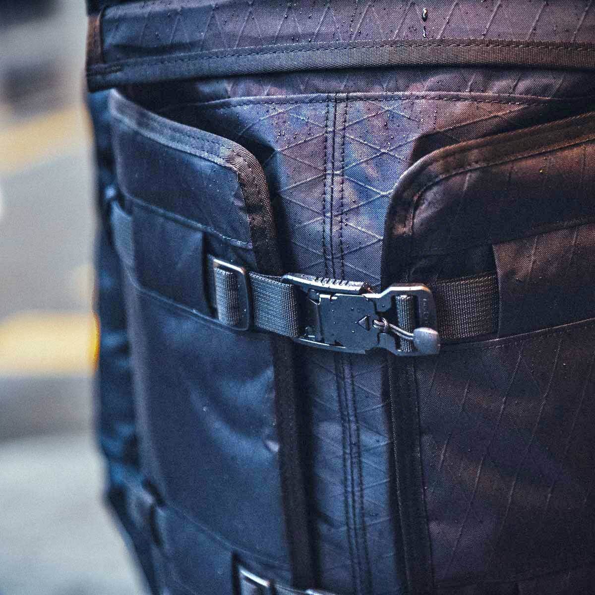 Horizontal exterior straps with quick-release buckles to store large coats, hats, etc. on the outside of the pack